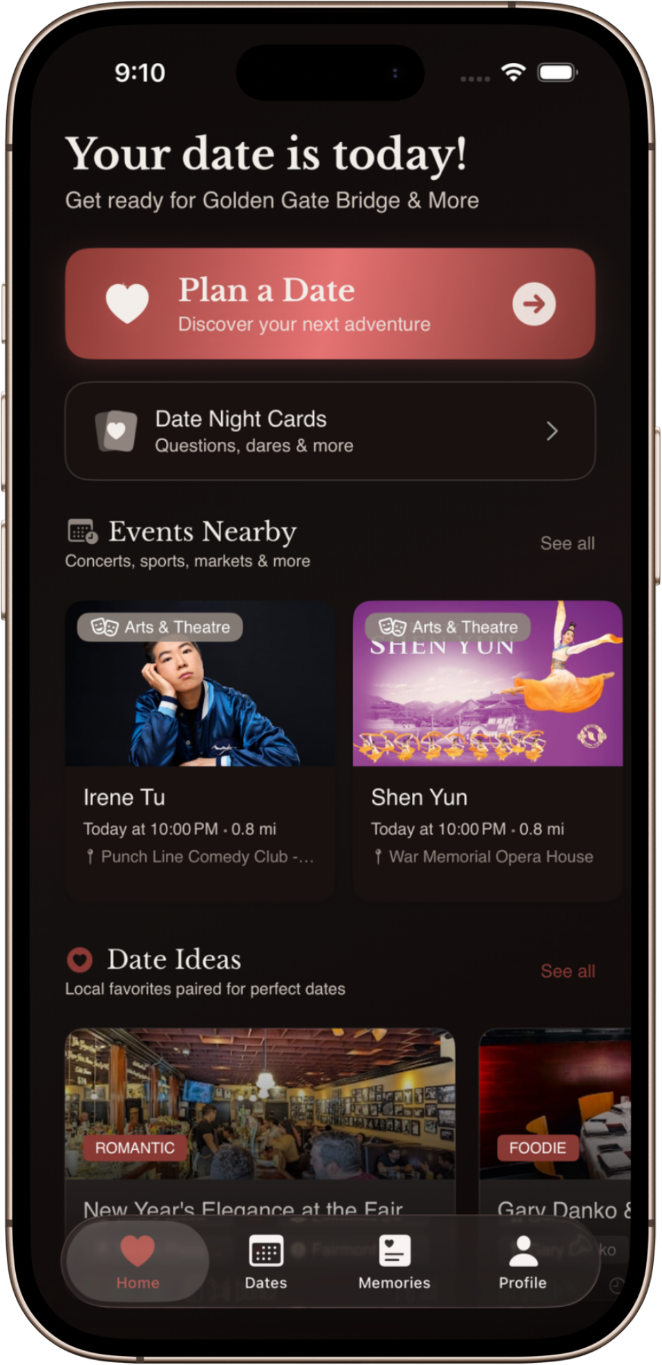 Powered by Google Places, Ticketmaster, and local event data — never made-up suggestions.